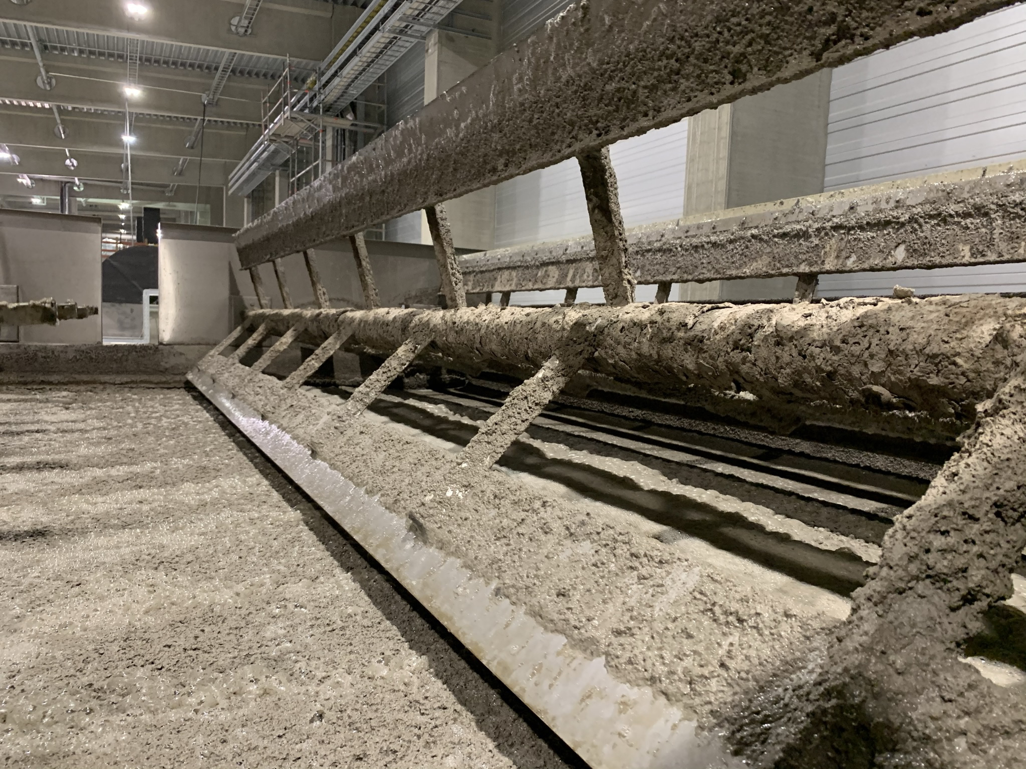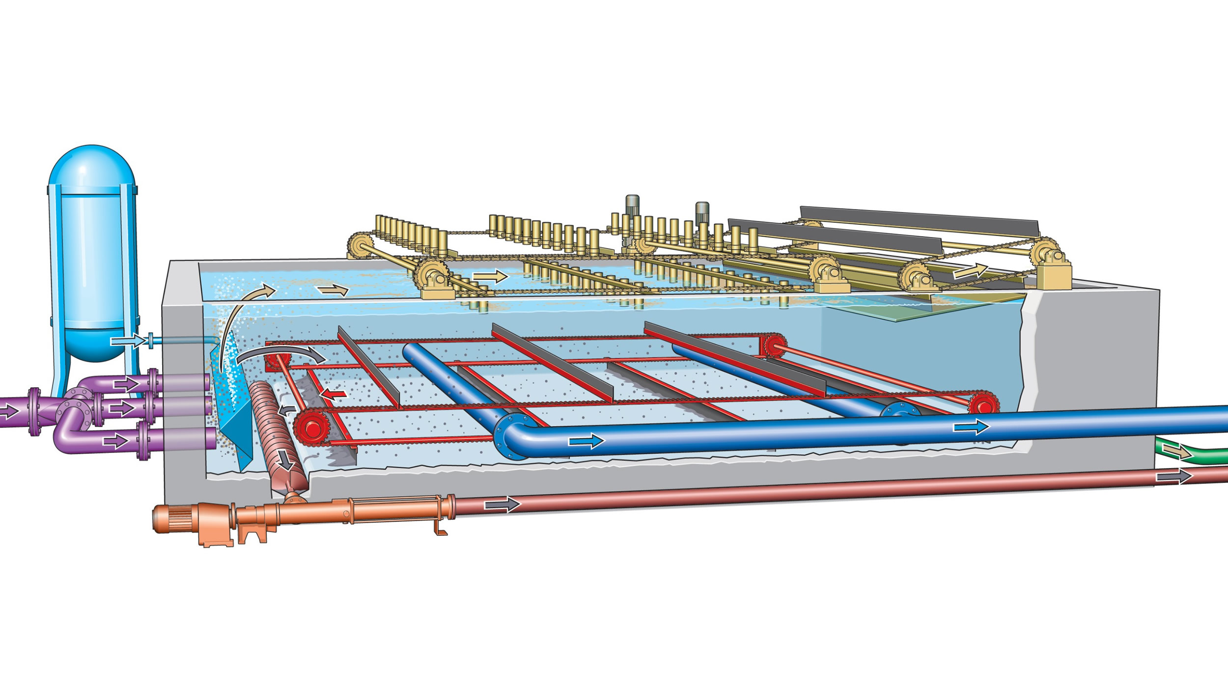 - Bottom scraper executed as continuous chain scraper or rake running near the tank bottom to collect any heavier, settleable sludge and to prevent dead zones