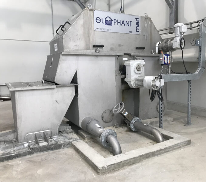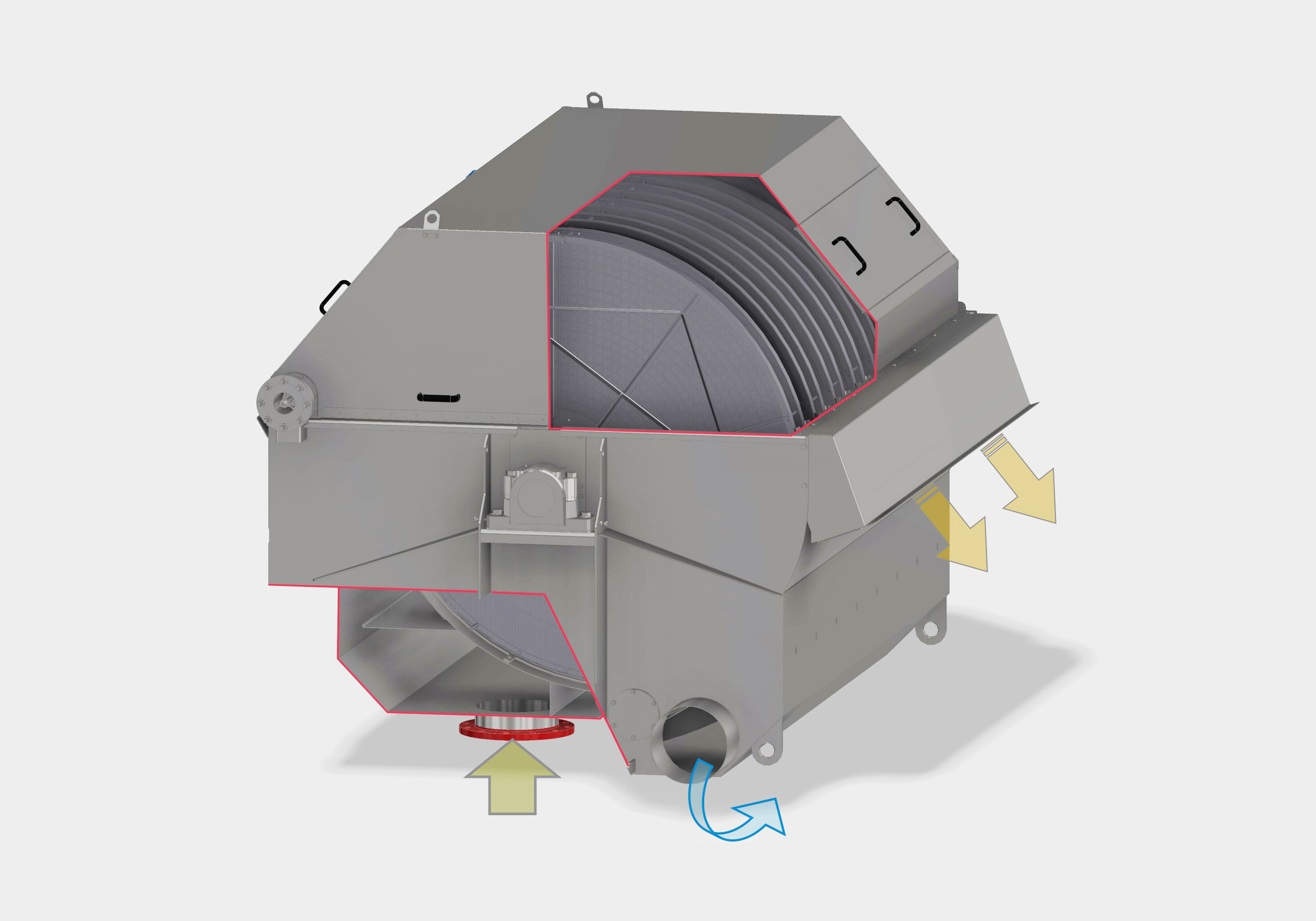 The Elephant Thickener / Filter consists of rotating disc pairs mounted on a shaft. Each disc is sealed against the machine vat by a highly resistant, long-life rubber sealing to ensure effective separation between feed and filtrate chamber. The feed suspension passes through the inlet chamber on the backside of the machine and distributes equally to all disc pairs. The water passes through the filter fabric mounted on the disc due to level difference between the feed and the filtrate side of it. The thickened solids are discharged on the frontside of the machine by the movement of the rotating discs. Backwash showers continuously clean the filter fabric. The filter fabrics are multilayer halve screen elements with mesh sizes of 100 to 800 µm. The filtrate water passing through the filter fabric is collected in a filtrate chamber and discharged from there through filtrate flanges. The water level in the machine vat is measured by a level transmitter and maintained by a level control valve in the filtrate pipe and by adaption of the rotation speed of the discs.