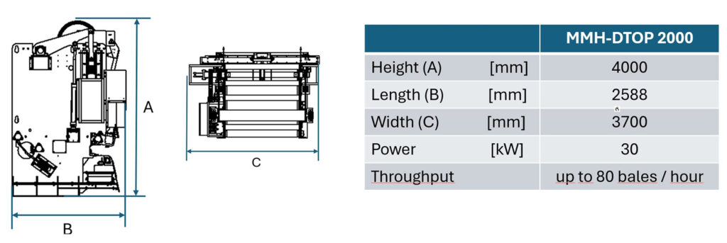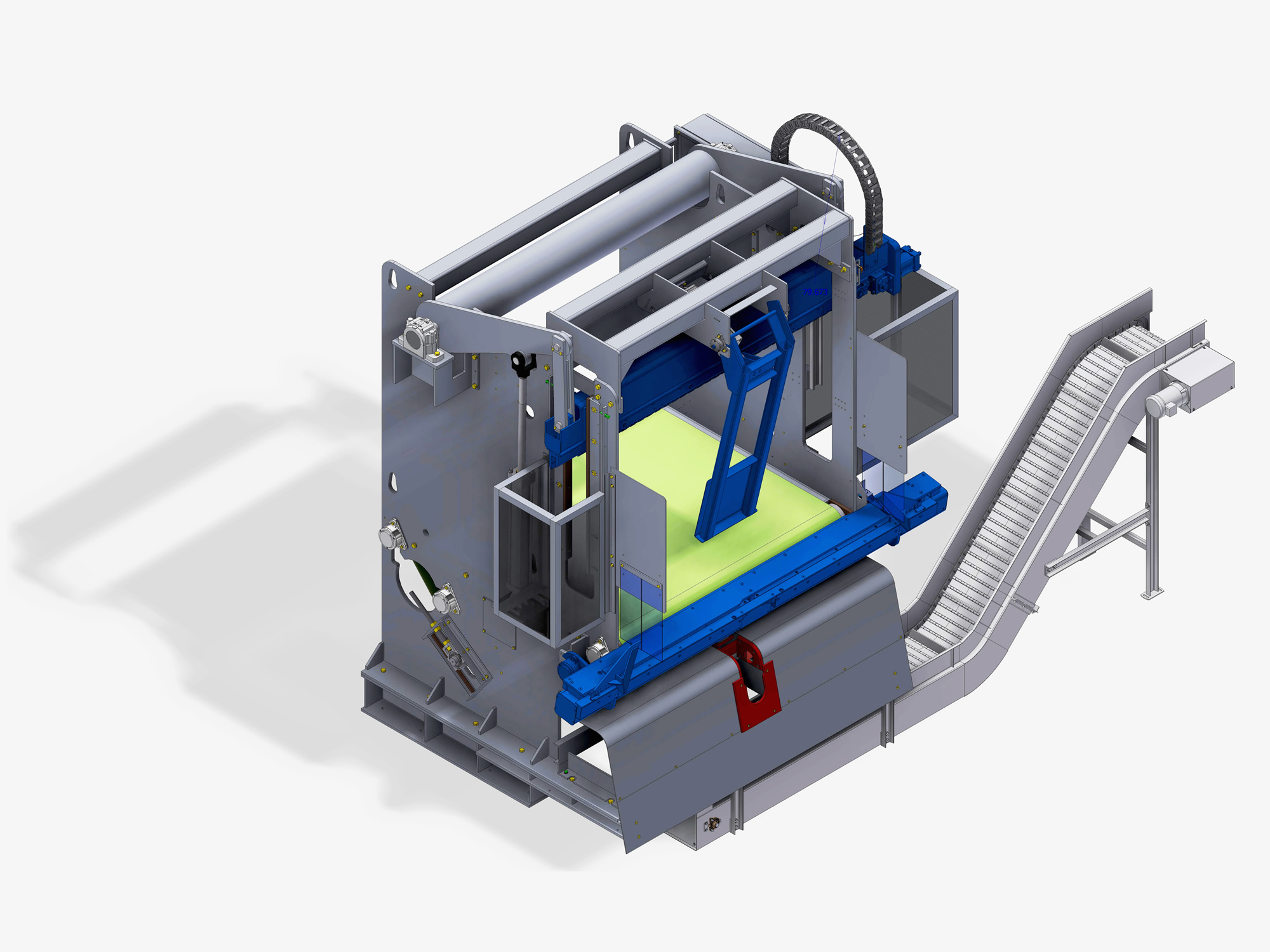 The automatic de-wiring machine is used to cut and remove wires on bales. An optional coil conveyor loads coils into a nearby dumpster.