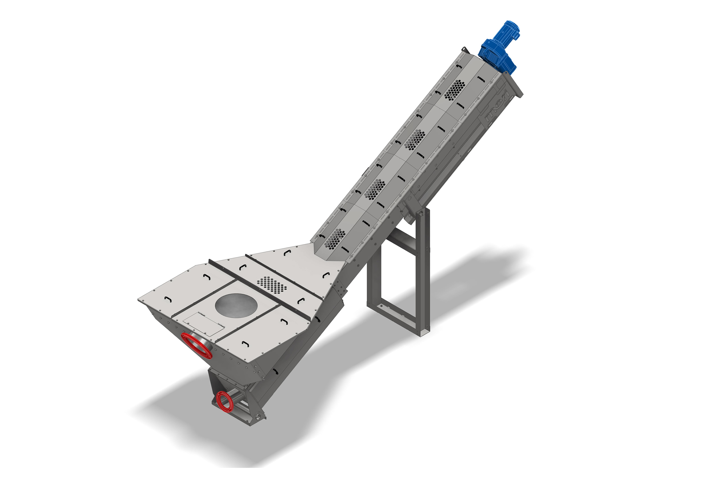 Rejects from junktraps (pulper) which normally occur discontinuously are poured into the inlet chute/pipe of the machine and get dewatered through a multi-element screen in the bottom part of the trough. The size (volume) of the hopper depends on the specific customer requirements so that different sized dump loads can be handled. The sinking level of water guides the rejects into the operating area of the spiral. From there, the rejects are conveyed by the spiral into for example a container. The machine can be operated continuously or discontinuously depending on the extent of the rejects.